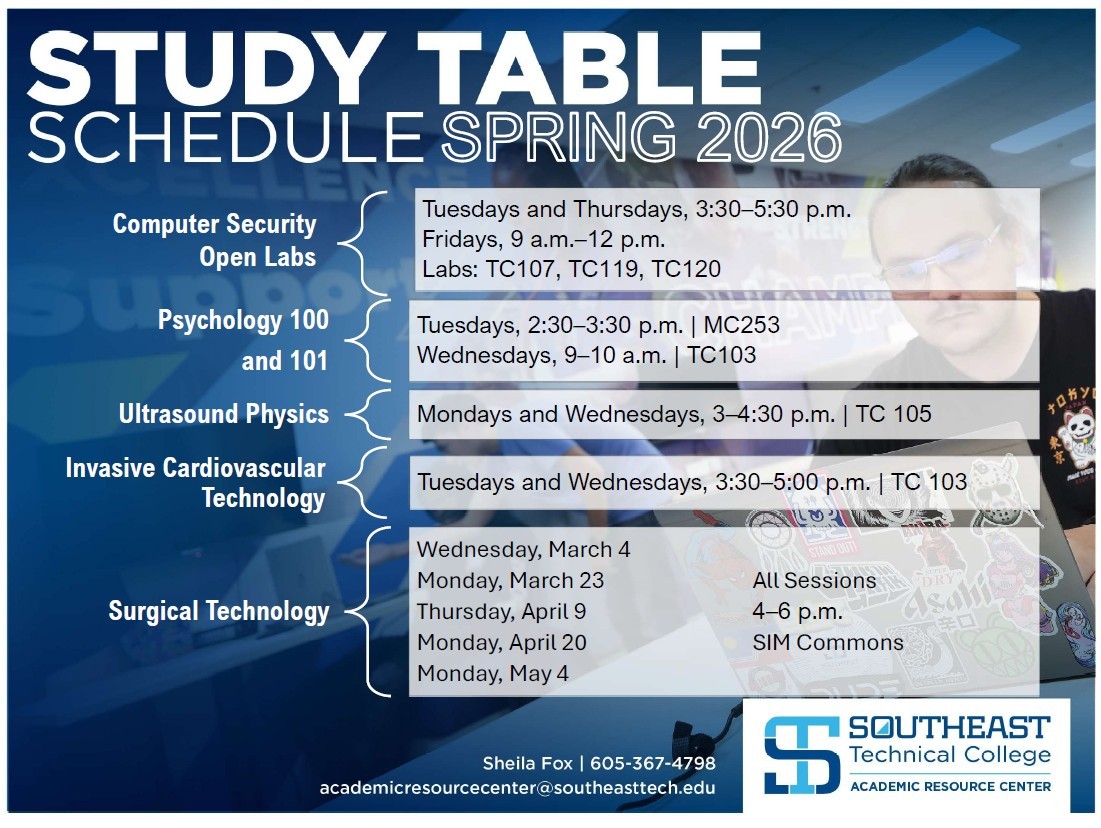 Southeast Technical College offers walk-in tutoring services to all enrolled students, free of charge. Students who want to improve in their coursework receive individualized attention from Southeast Tech's faculty, professional and peer tutors. Through the program, students hired to be tutors have a desire to help others learn and hold excellent GPAs. There is also tutoring over Microsoft Teams to help with busy schedules.